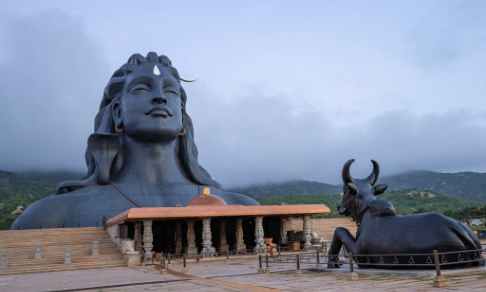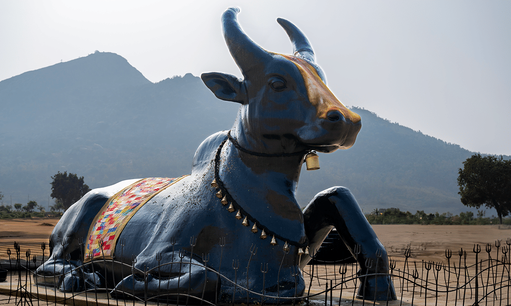 Nandi, Adiyogi's devoted gatekeeper and eternal companion, is also revered as an access point to Adiyogi. This 21-ft Nandi has been consecrated by Sadhguru with two powerful lingas, one in each horn, to nurture wellbeing in all aspects of life.