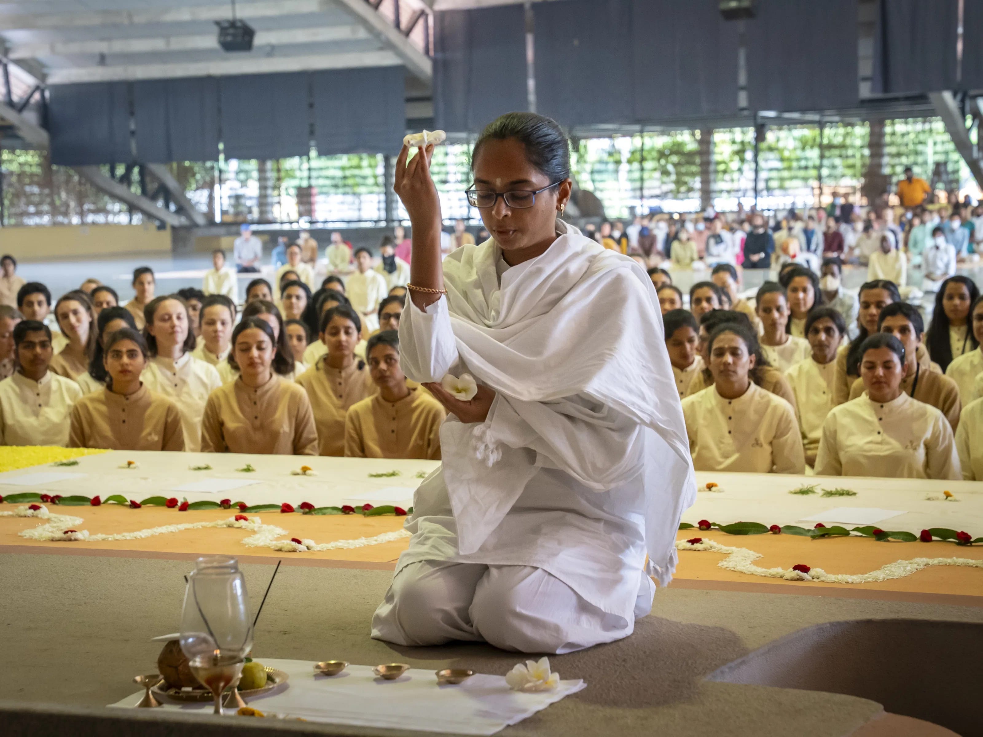 Cuando hacemos Guru Pooja, organizamos todo de una manera específica: las flores, el agua, cada elemento en su lugar. El simple hecho de mantener estas sustancias en un orden determinado y moverlas de una manera concreta crea un campo de energía.