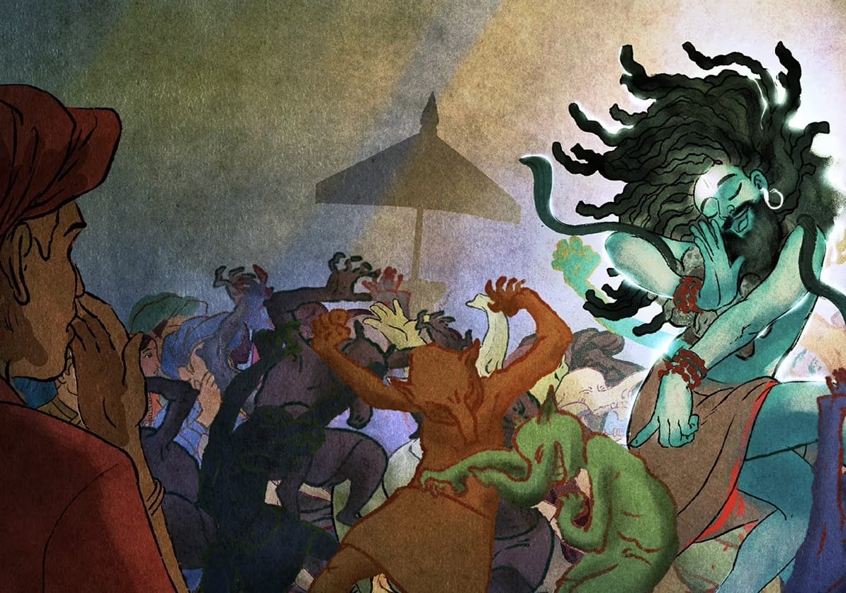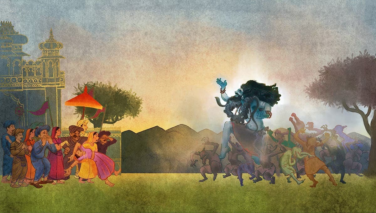 Adiyogi llegó, con sus casi 2,80 metros de altura, su cuerpo envuelto en una piel de elefante que todavía goteaba sangre. Lo acompañaban todos sus amigos, un grupo de duendes sin forma que creaban una cacofonía de ruido, diferente de cualquier lenguaje humano. Todos estaban muy ebrios, y Adiyogi entró como un elefante. La madre de Párvati, Mina, miró esto y dijo: «¿Qué? ¿Este es el hombre con el que se casará mi hija?». Incapaz de imaginarlo, perdió el conocimiento.