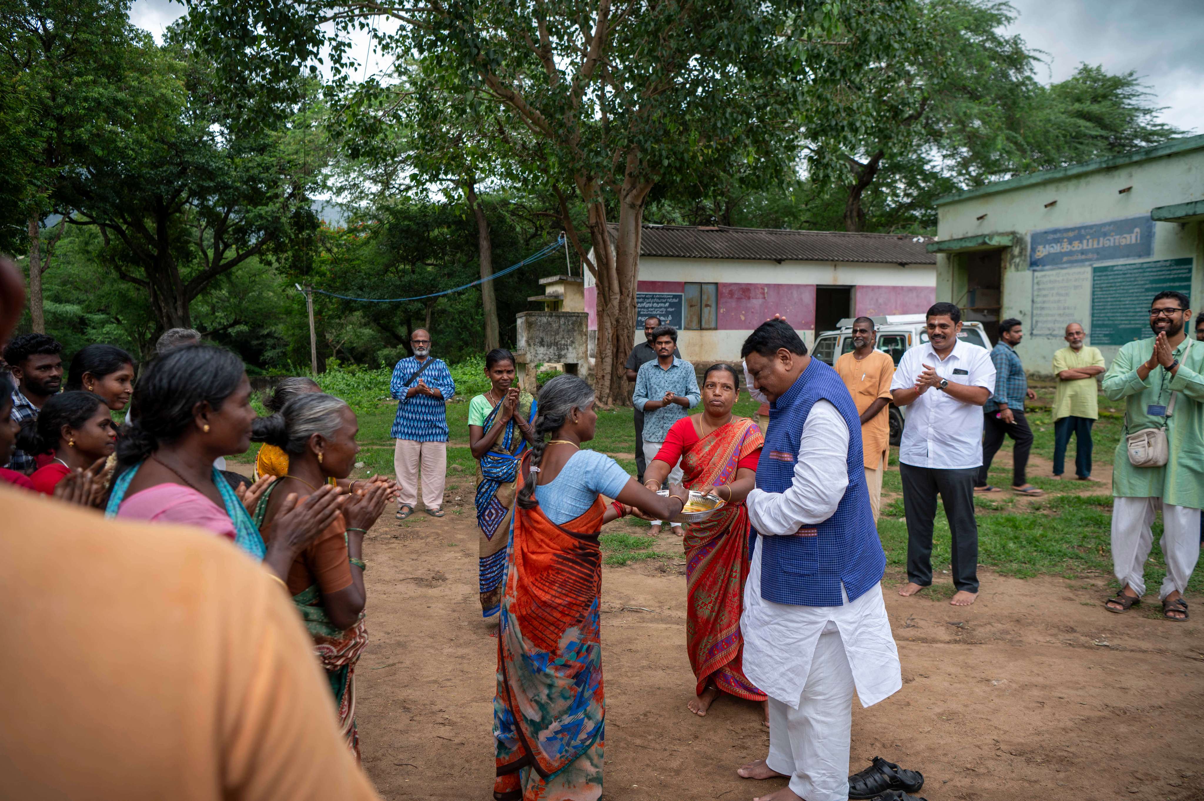 The Minister explored the consecrated spaces of Isha Yoga Center before visiting a nearby tribal village supported by Isha’s rural outreach programs. He witnessed firsthand the remarkable entrepreneurial journey of tribal community members, particularly women, who have transformed modest beginnings into thriving businesses.